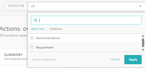 - Action Type: Use this filter to switch between Recommendations and Requirements. You can select one or include both to compare activity, and once you apply your selection the charts and tables refresh straight away.