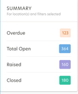 Summary: The Summary includes key performance indicators (KPIs), which are high level measures that show performance at a glance. It shows totals for Overdue, Total Open, Raised, and Closed actions. This gives a quick snapshot of current activity and helps you see where attention is needed.