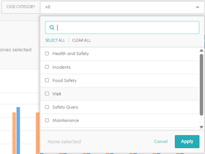 - Case Category: Use the Category filter to focus the report on specific categories or view them all. Choose the categories you want to see and the charts and tables update to match your selection.