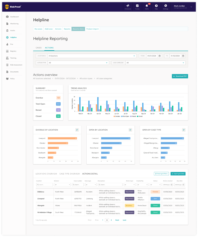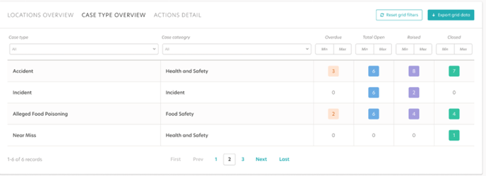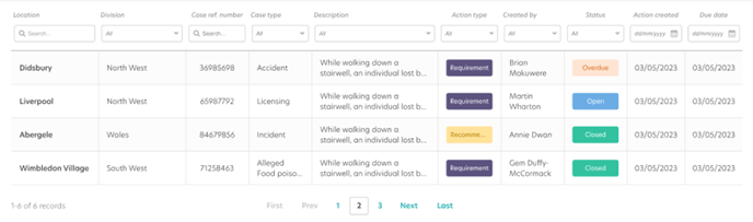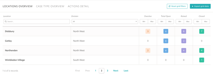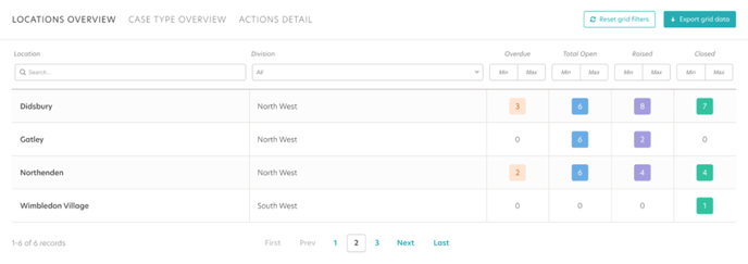 Each of the three charts helps you spot where open and overdue actions are highest, whether by location or by case type. Use them individually to identify priority areas and direct attention where it’s needed most.