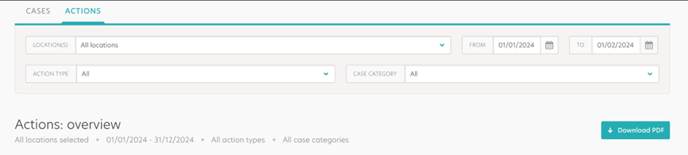 Location: The ‘Actions’ report defaults to displaying data for all locations you have access to. You can narrow your focus using the Location Selector filter, allowing for quick customisation. Once applied, charts and data grids update immediately reflecting data based on the chosen location(s).