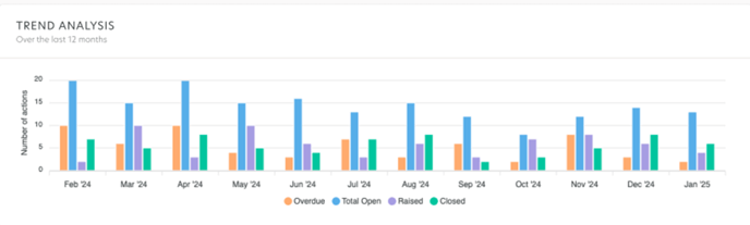 - Trend Analysis: The Trend analysis shows a 12 month bar chart with the number of actions by status for each month (Overdue, Open, Raised and Closed). It helps you compare months, see where volumes are increasing or decreasing across statuses, and spot patterns or spikes. Use this view to monitor overall activity and direct attention to areas with rising or persistent volumes.