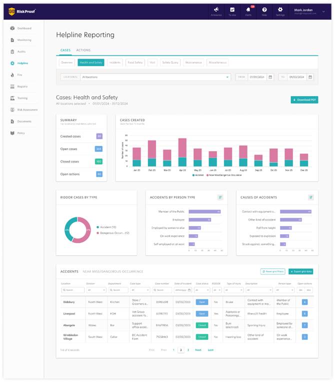- Cases Created: A 12-month stacked bar chart with the number of health and safety cases by status each month by case types.