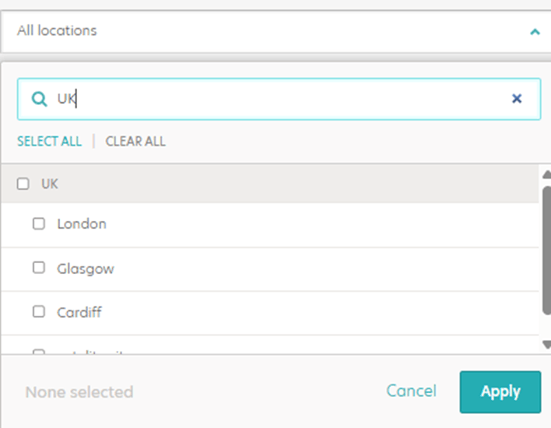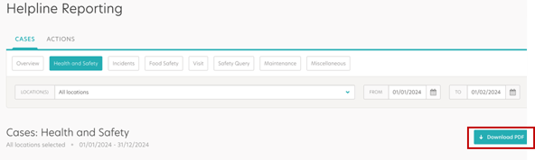 - Location: The ‘Health and Safety’ report defaults to display data for all locations you have access to. You can narrow your focus using the Location Selector filter, charts and data grids update immediately reflecting data based on the chosen location(s).