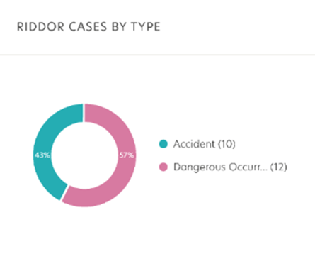 - Riddor by case type: This card provides a clear visual breakdown of all RIDDOR cases by case type, helping users quickly understand how RIDDOR incidents are distributed across different case types.