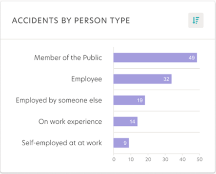 - Accidents by person type: This card highlights the top five person types involved in reported accident case, with a sort option to view the top five or bottom five types