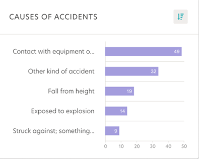 - Causes of Accidents: This card highlights the top five causes of accidents recorded across all accident case types with a sort option to view the highest or lowest causes.