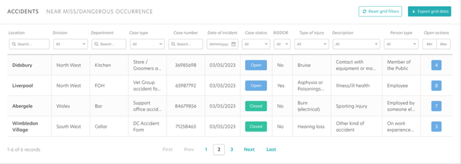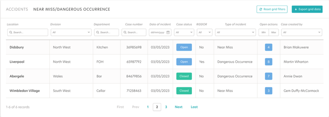 The Near Miss / Dangerous Occurrence data grid provides a clear view of all reported near misses and dangerous occurrences cases, including: