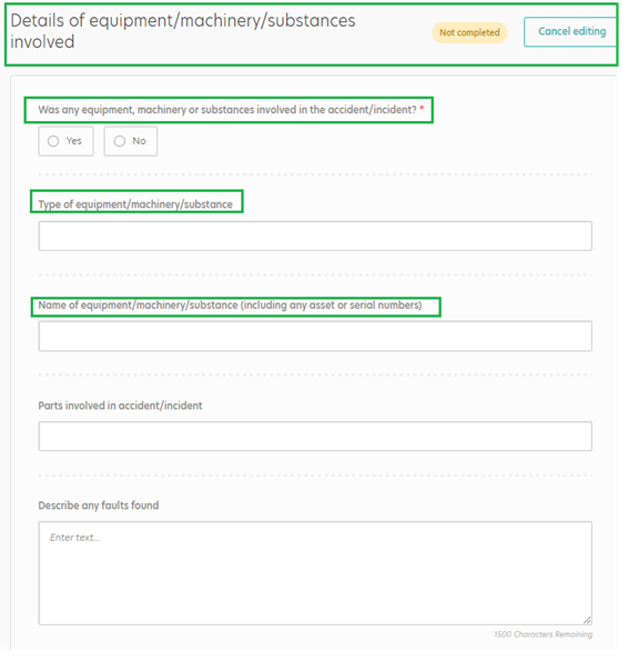 - Section name changed from 'Details of any equipment/machinery involved' to 'Details of any equipment/machinery/substances involved'.